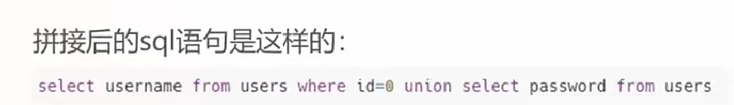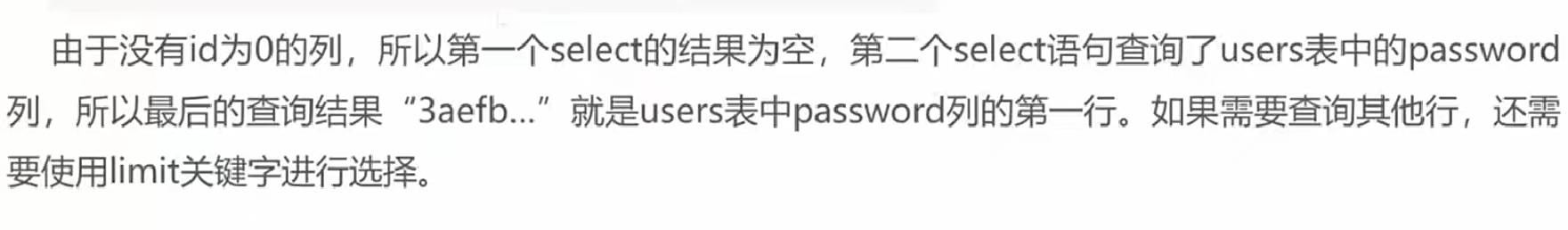 union功能作用: 合并两个SELECT结果集,要求列数相同。通过id=0使前查询为空,后查询显示敏感数据。 前提要知道有password这个列和users这个表