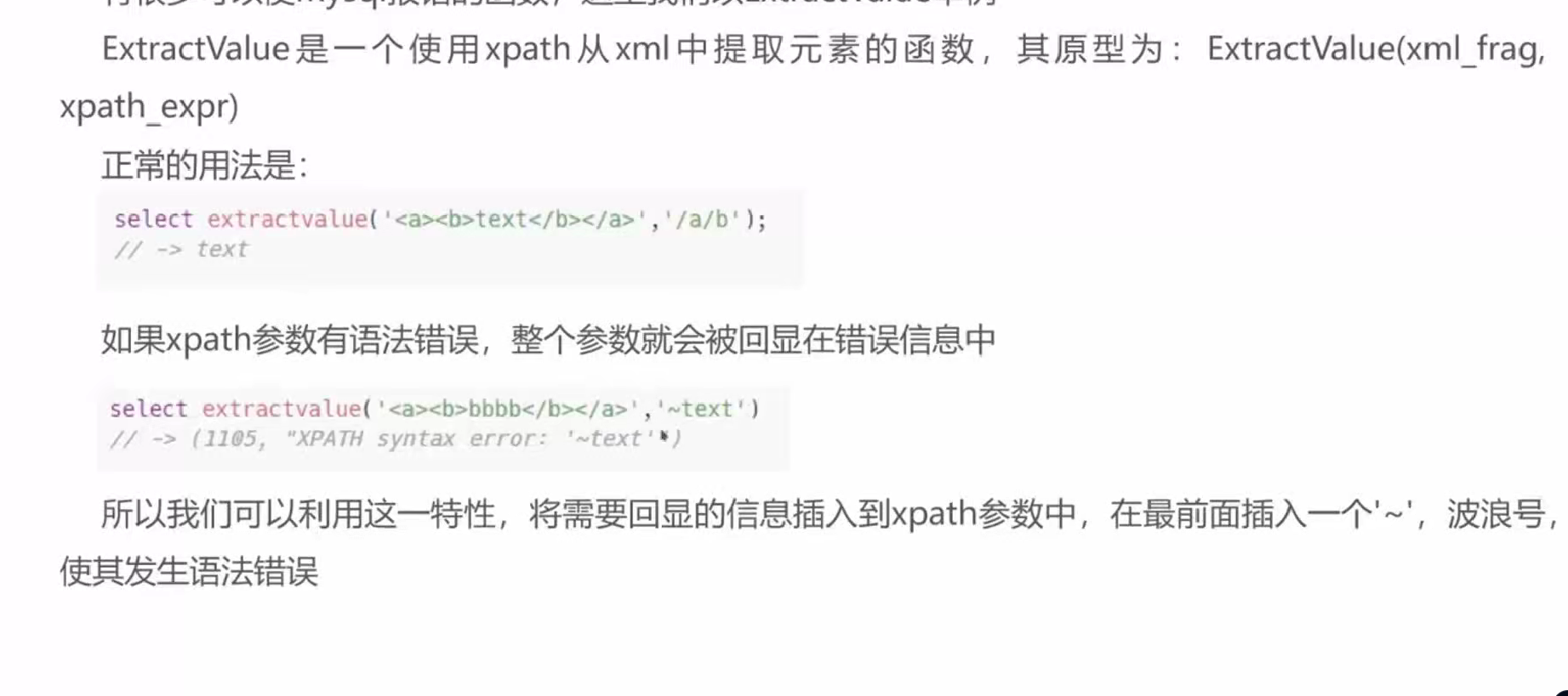 - 函数原型: ExtractValue(xml_frag,xpath_expr)