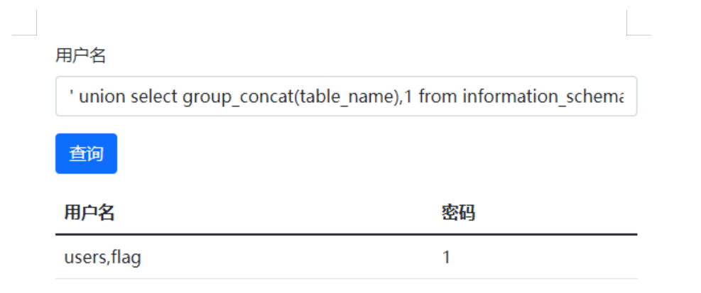 使用‘ union select group_concat(table_name),1 from information_schema.tables where table_schema=database() #查询同库的表,发现了users表和flag表